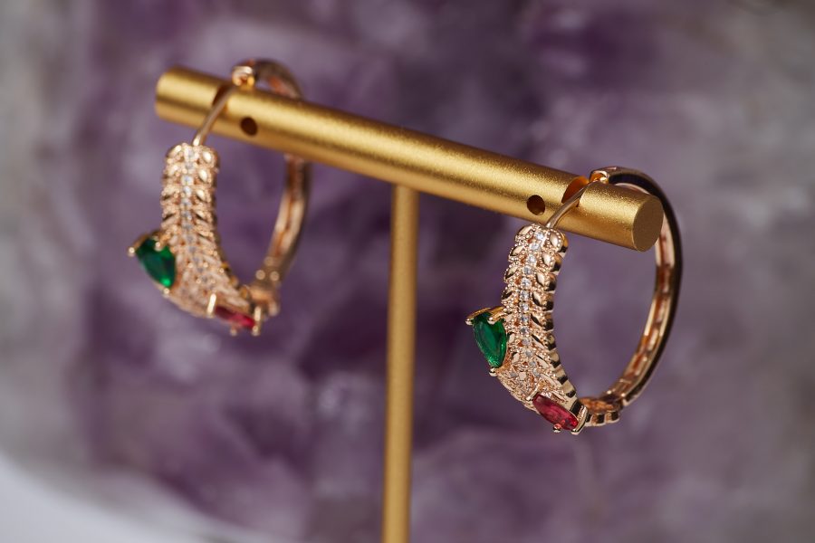 Découvrez Rosy, la paire de boucles d’oreilles qui conjugue raffinement et éclat sophistiqué. Dorées à l’or fin, elles sont sublimées par un jeu de pierres étincelantes aux reflets verts et rouges, parfaitement mises en valeur par une délicate structure ajourée. Chaque création révèle une alliance unique entre modernité et élégance, pensée pour magnifier votre visage et compléter chaque tenue.